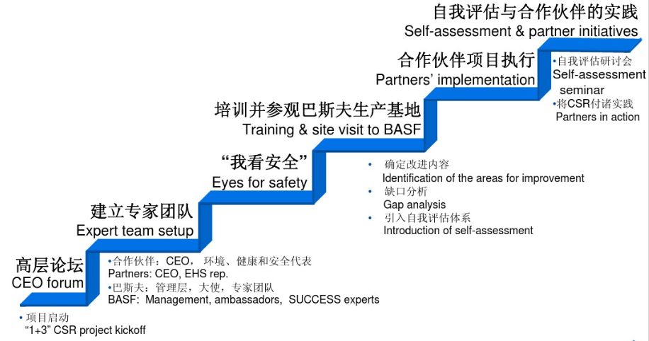 巴斯夫遵循自愿原则选择项目合作方,为每个客户配备一个项目小组,由一名巴斯夫客户代表“大使”和一位负责HSE的专家组成。巴斯夫根据各企业的自身特点,为合作伙伴量身定制解决企业社会责任薄弱问题的方案。针对共性问题和企业的个别需要,开展有关环保、职业健康安全等多方面的培训;针对合作企业的整改情况,进行相应的评估检查,开展研讨会分享实践经验,更好的提升实践成效。