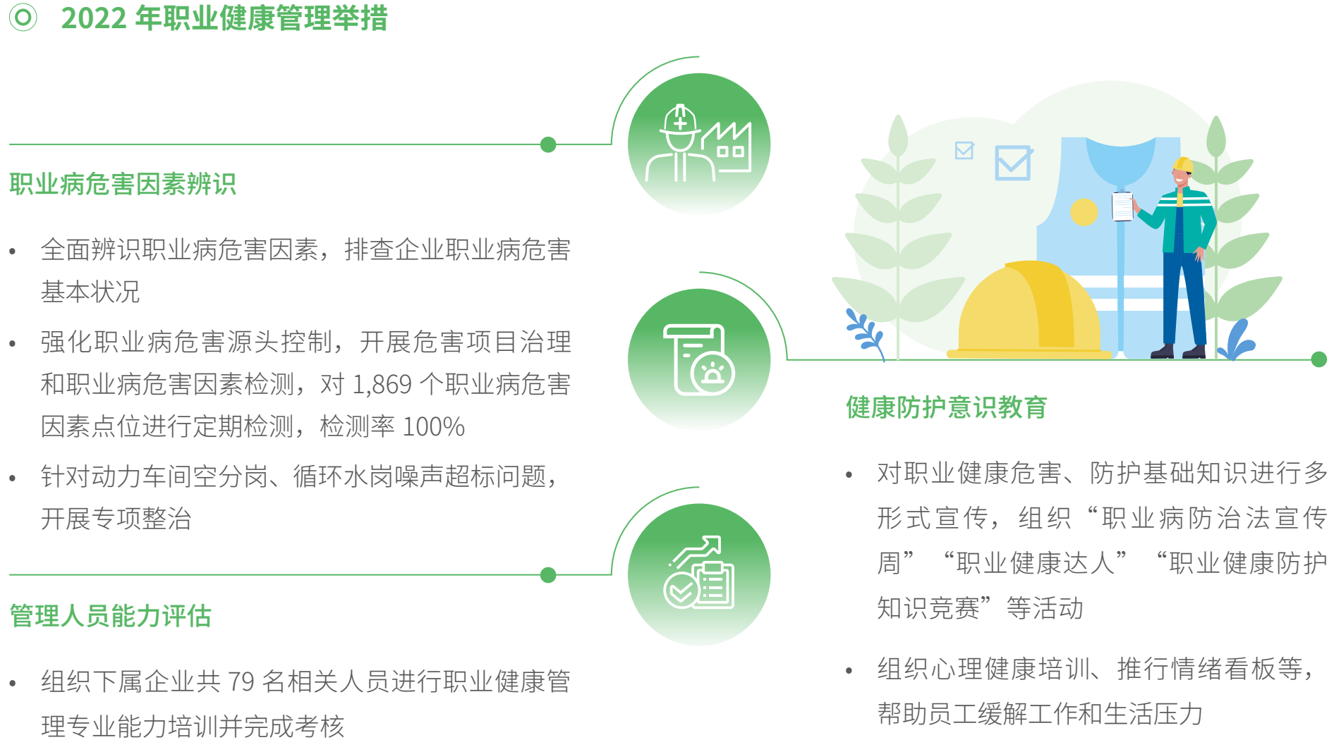 中化国际制定《职业健康管理办法》等制度,不断完善职业健康安全管理体系,每年开展职业病危害因素辨识评估,深入推进职业病危害治理,组织开展“职业健康达人”“健康企业创建等活动,消除各类潜在职业健康风险,持续推动职业健康水平提升。